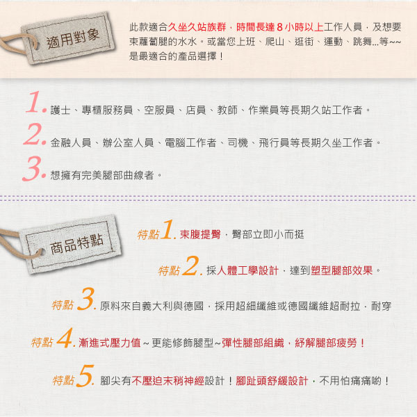 西德棉材質,初次穿著首選,改善腿部線條 。